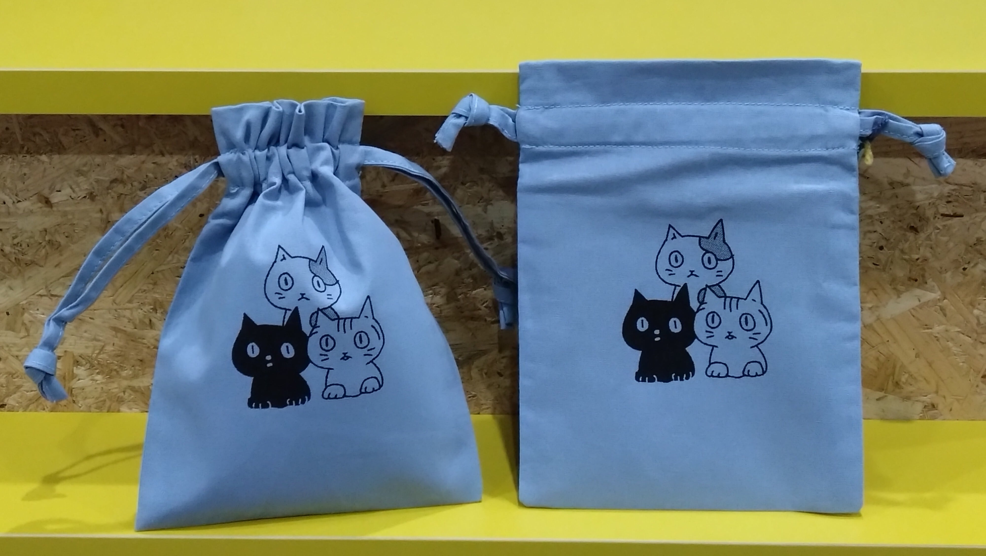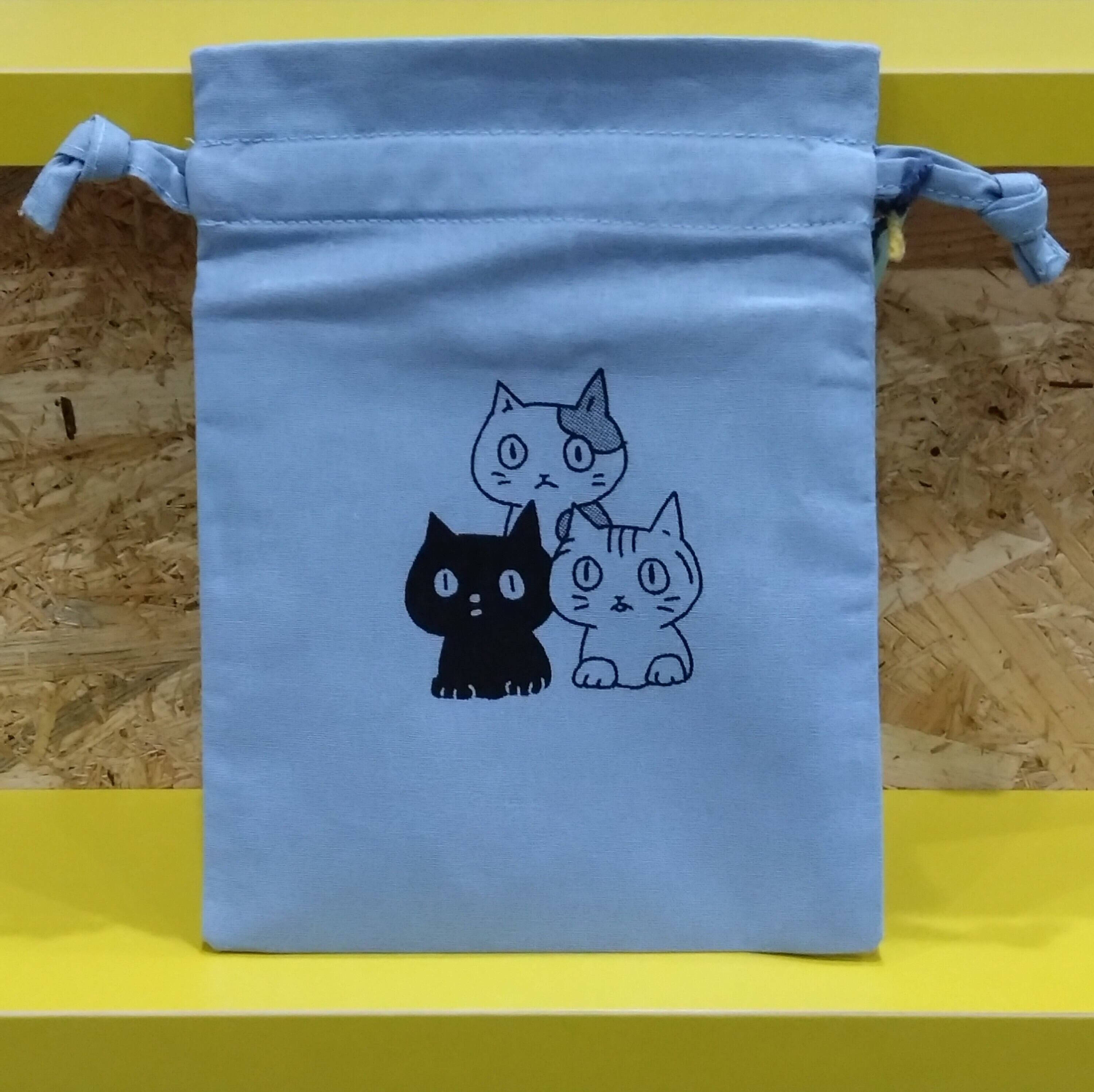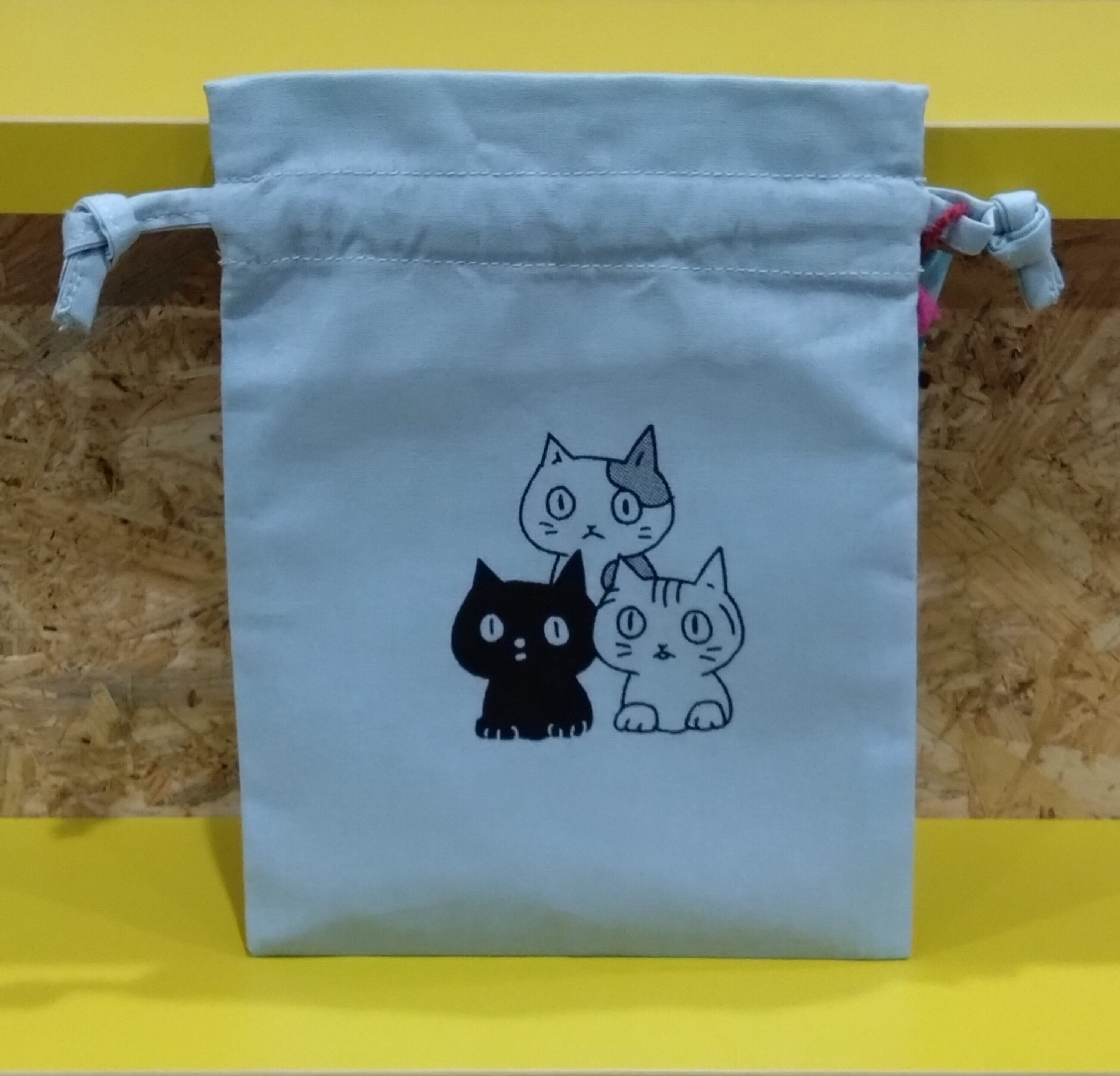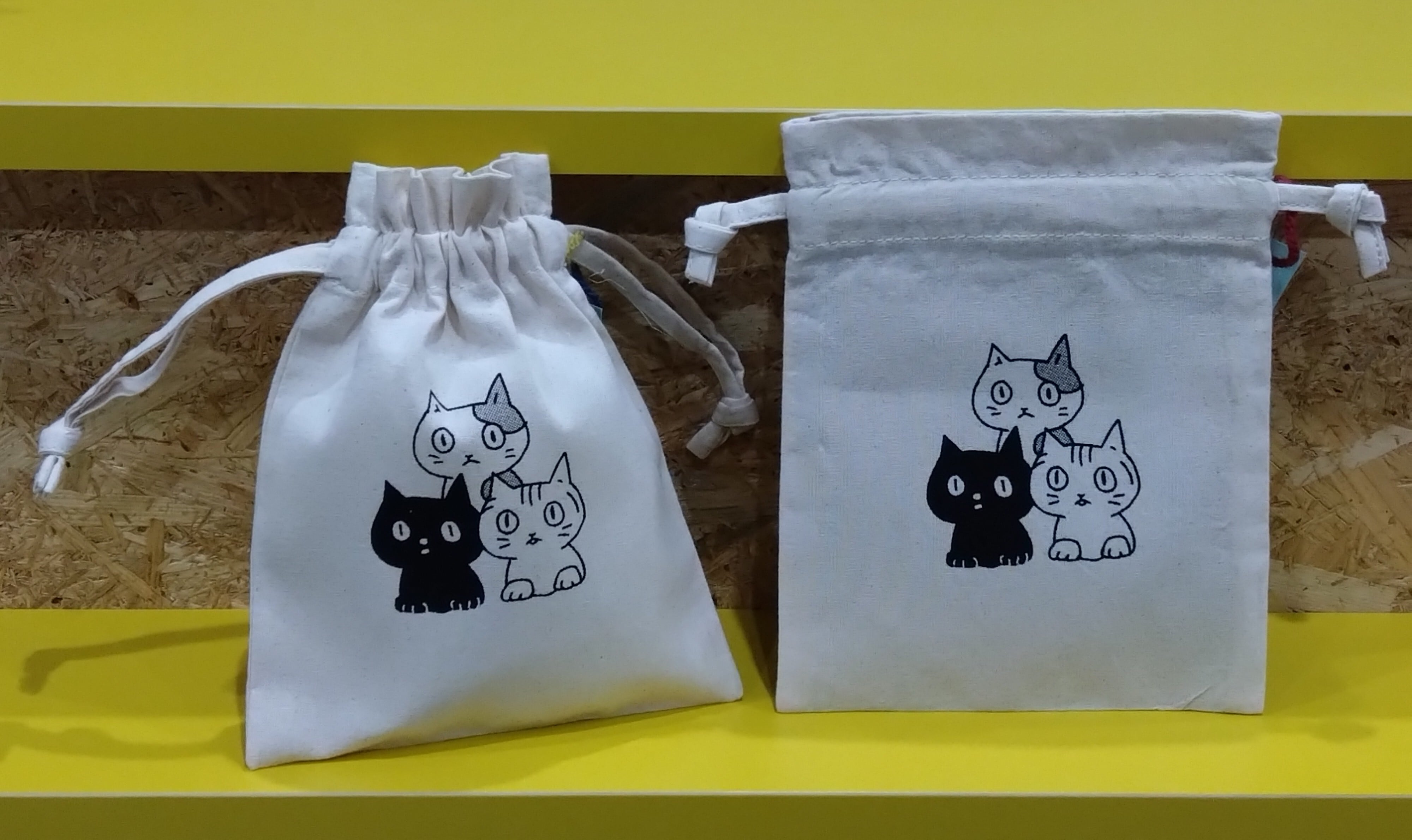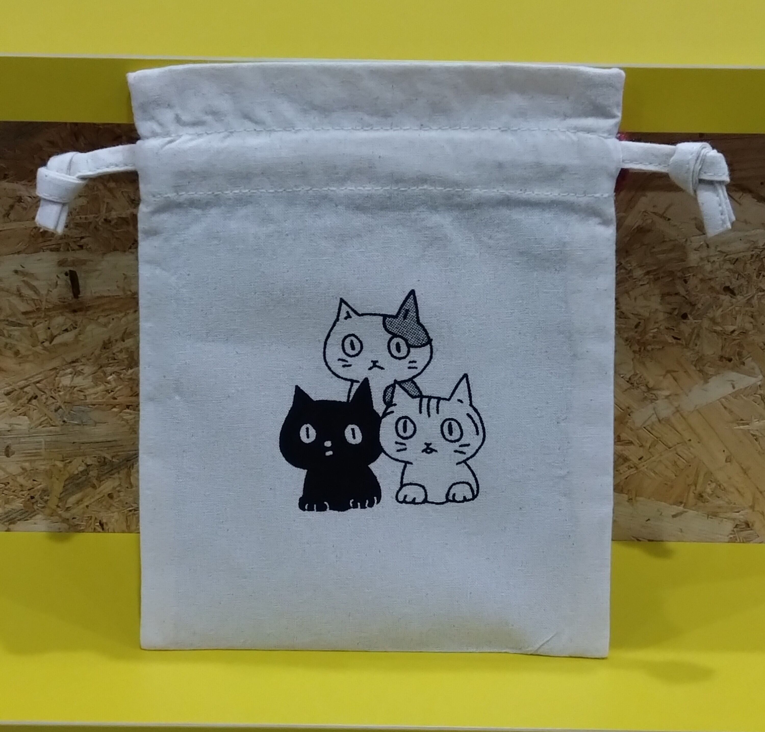 ミケ、クロ、サバトラがプリントされた巾着です。